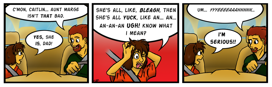 One of the fun things about re-drawing old strips is getting to play with and perfect the characters' expressions. When this was drawn 12 years ago, Caitlin's expression in the second panel was nowhere near as spastic as the one you see above. Back in May 2010, when I was re-drawing these, one of the things I strove to do was improve the expressions and body language of the characters. I consider this strip a huge success on that front.