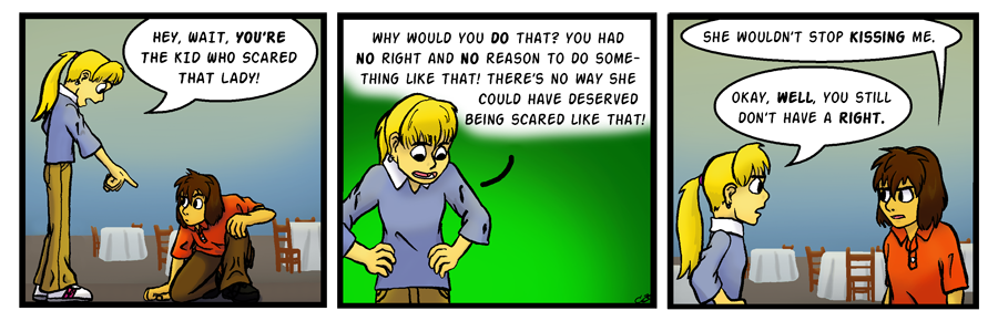 This strip needed some serious editing in Photoshop... when I scanned it into the computer I realized in the first panel Caitlin looked like she was going to bite the girl's finger off. 0_o