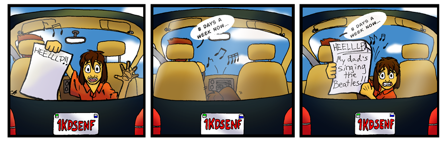 My dad laughed pretty hard when I first drew this at 12, making it one of the times I was sure he was genuinely laughing and not just trying to encourage me. Everything about this strip, down to that license plate, were from the original strip. Practically no alterations were made during the rewrite process.