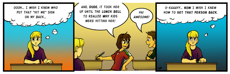 This strip underwent very few alterations during the re-draw stages. Sarah's expression in that last panel says it all for me. Caitlin's in for it. XD