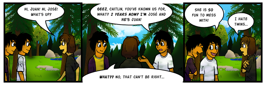 Originally, José was an afterthought when I first wrote JC. After several months of just having Juan and Caitlin goofing off, I realized Juan was missing something, and in a way so was Caitlin: They needed a third member to their group. So José was written into the storyline. He never had an introductory story of his own; rather, he appeared in a 6-day silent strip series, and just kept appearing after that. During the rewrites, I realized José is too pivotal a character, with too much depth and potential to just be slid in sideways. So I brought him in a bit earlier to make him more meaningful. I think it was the right decision.