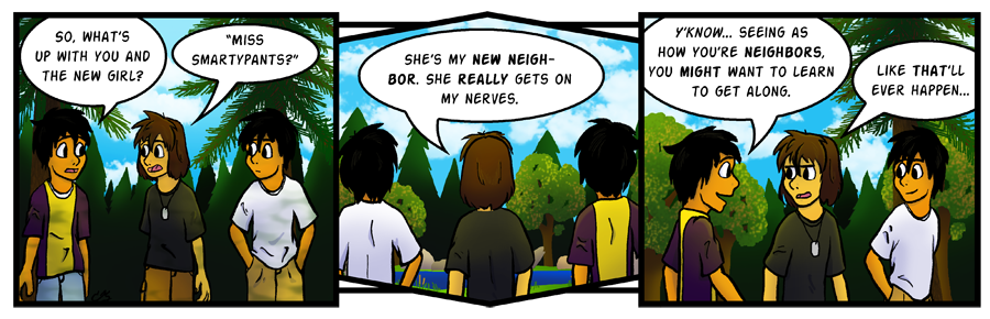 I had a lot of fun with the lighting and shading in these last two strips. I liked showing the dappled leaf shadows on Caitlin, Juan and José. They spend a lot of time hanging out in the woods behind their neighborhood.