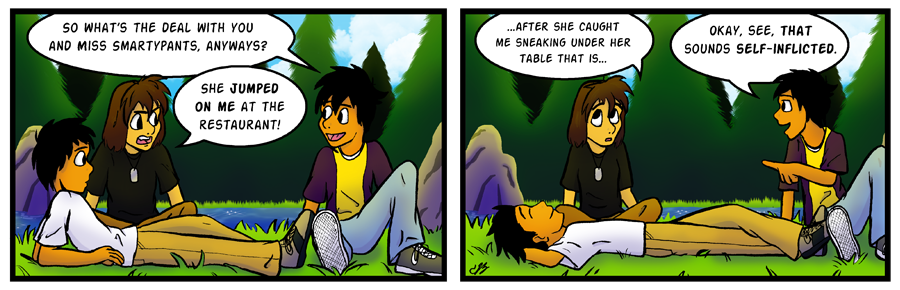 Ahh, the lake. I had a lot of fun drawing that. This lake will be appearing again and again as the strip carries on; Juan, Caitlin and José needed a great hangout spot, and this fit the bill perfectly.