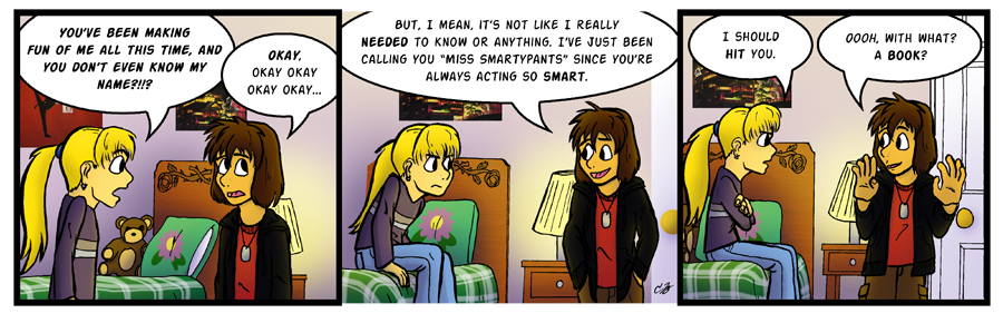 Caitlin really shouldn't be taunting her right now... especially not when we all know this girl's got an entire bookcase full of books, and more than one of them looked kinda heavy...