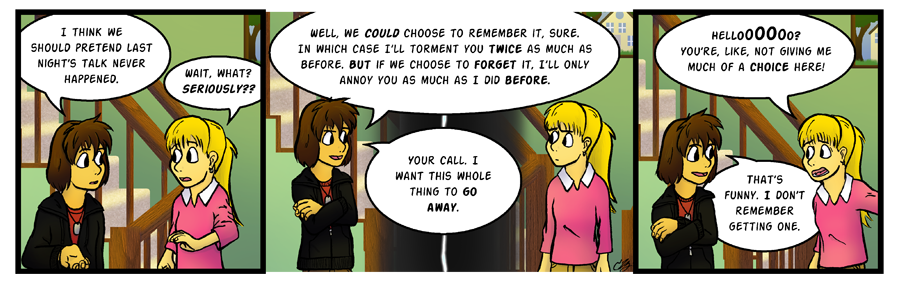 Poor Sarah. She really thought they'd had a moment there. There's something to be said for the childhood whimsy that bad things can simply be put out of mind and therefore not be an issue... Reality, unfortunately, doesn't tend to allow this to happen.