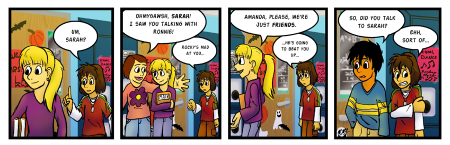 I identify 100% with Caitlin in this strip. As it happens, nerdy little kids who run around with sketchbooks all day, every day don't tend to be very popular, and are often picked on by the popular kids. Which made approaching said popular kids a very uncomfortable task. Granted, Sarah's really sweet, but she's with at least one other popular kid so this requires some hesitation on the part of the non-popular kids. It's all about that Middle School Food Chain, really.