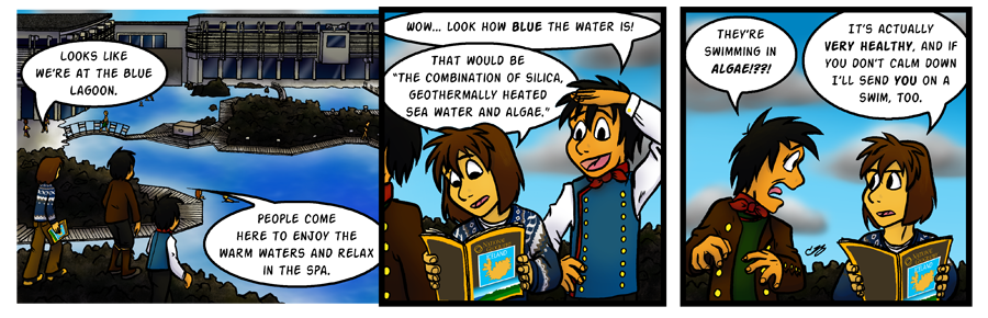 In addition to what Caitlin read off the magazine, the sea water in the Blue Lagoon is replenished every 48 hours; the water temperature stays at a comfortable 99-102 degrees Farenheit (37-39 degrees Celcius). The rich mineral content comes from the underground geological layers. The lagoon is actually man-made and there is a research plant nearby that researches the impact of minerals on the skin and possible cures for skin disease.