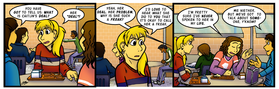 We are almost done with the cafeteria scenes... maybe two or three more strips until we're done, which I am looking forward to because these are HARD to color. It's part of what's kept me on biweekly updates for so long: I don't want to put a half-baked product forward, which means slowing down a bit. Between having a full-time job and another strip on the side... this isn't easy. Thanks for being patient with me.