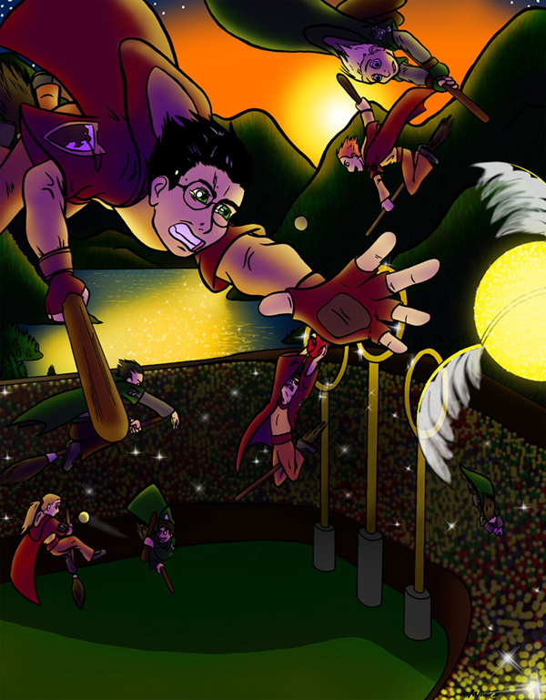 This was the final of the 3 drawings I did for my siblings for Christmas 2011. Harry Potter chasing the snitch. While I missed the simplicity of the Cinderella picture, all the detail put into this picture was fun in its own way. I personally consider the best part of this picture to be the lake in the background, but that's just me. The depth and flow of motion was pretty okay, too, but I like sparkly things. And the lake is sparkly. Also notable in this piece: this was the first serious picture I've ever done using my new Winsor & Newton sable brushes. It's gonna be hard to go back to the Pocketbrush Pen after learning to use these...