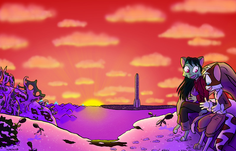 Mace and Lilith again from Dreamkeepers, enjoying a pretty Valentine's Day sunrise. I debated posting this one, considering it was really just a distraction piece; at the time this was posted (Feb. 2012), I was in the middle of color blocking for Just Caitlin. Color blocking is arguably the most tedious part of the coloring process, and it was wearing me down so I took a break to throw this together. If there's one this I like about this picture it's the shadows. I used this for some shading/ light positioning practice, and it could've been worse I suppose.