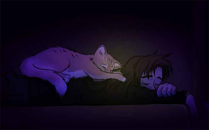 Another picture drawn with a concussion. At the time I drew this, I'd had the concussion for a full month, which means I spent a LOT of time at home trying to heal. We have a cat, Tigger, who's technically my sister's cat but he follows me around EVERYWHERE (I guess he's claimed me as his personal human???). At any rate, being home so much means seeing more of the crazy fuzz, and at some point he seems to have decided it is his personal responsibility to take care of me. Every time I lay down to take a nap, he walks up to my face to inspect me or make sure I'm not dead, then goes and lies down.
