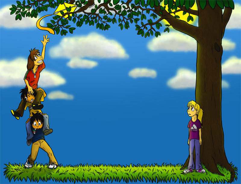 This was the original design I had for the main page of the Just Caitlin website. I had the kids standing beneath the tree on floating grass; I was going to do a cloud background behind them, but I ended up ditching this when my brain stumbled upon the current design for the JC website. I don't regret dropping this design at all... not that I dropped it in its entirety, I kept the kids for the "summer" phase of the website.