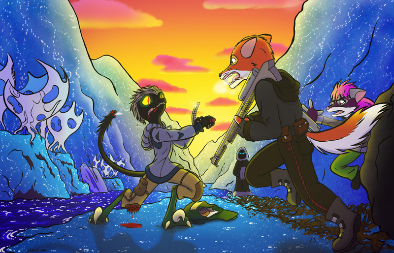 This was a commission for a fellow DA member, Kafelnikov. That's his character, Hal, getting ready to give that orange wolf what for. This scene is from the 3rd chapter in his Wayward Astronomer fanfiction series.