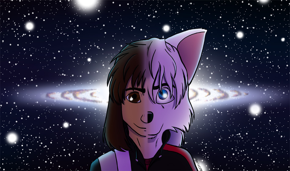 I always wondered why I always see people draw their anthro characters, but I never see them draw their anthro forms next to their human selves. Hence the motivation for this picture. Unfortunately that galaxy gave me untold amounts of grief, but it'll have to do.
