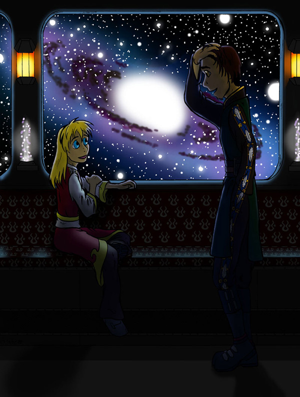 Crystal and Roan again... The goal for this picture was to better capture dark lighting, light source, and above all to practice drawing stars and galaxies. There are a lot of things I like about this picture, but if I'd known at that time what different brushes in Photoshop could do, I'd probably like it a lot more.