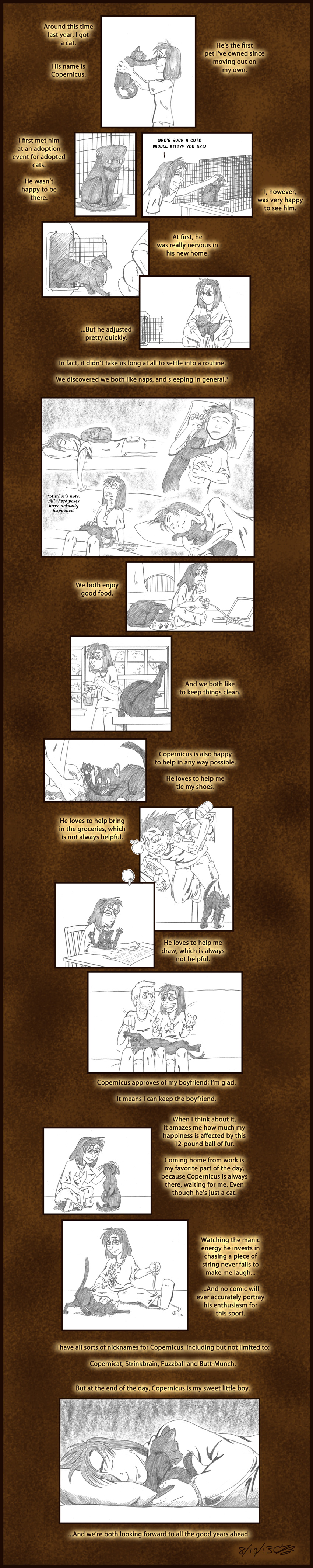 I'm pretty sure it's true when they say the pets we own reflect who we are. Copernicus is a quirky, offbeat little guy who looks like he fell out of a cartoon strip, but for all his silliness he's actually pretty smart, and very little of what happens in our apartment escapes his notice. He's the best cat a human could ask for.