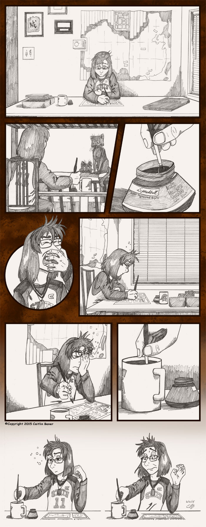 This took WAY longer than I intended to put together; I have been so outrageously busy these days, and on top of that I ended up putting far more detail into this drawing than I'd originally intended. But about 6 weeks after I started it, it is now finished. I also learned that drawing myself tired in effect makes me feel very tired, which meant I had to keep putting this down after drawing part of a panel. That yawn killed me.
