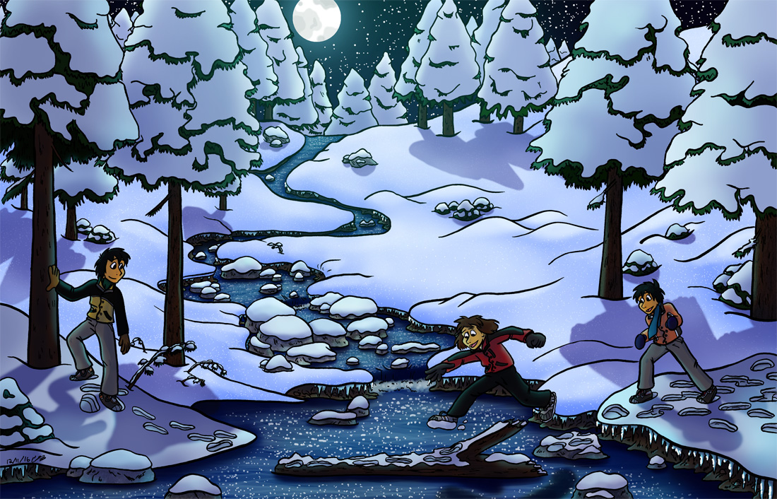 This is the last "Just Caitlin" comic or picture of 2016! This is the 2016 holiday image. It wasn't my intent to have two full-color images where Caitlin is hopping across a creek (as in this image here) but by the time I realized the redundancy it was too late. Ah well. At least this one has sparkly stuff! 8D