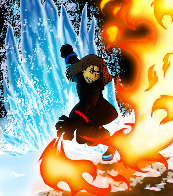 Oh my, this was FUN to draw! I have a real thing for fire and ice. I was in a really bad mood when I started this, but in such a great mood when I finished. Unfortunately, however, this is going to be one of those drawings I look back at later on and uncontrollably start banging my head against a desk... It was fun but there are a lot of things I really don't like about it. The character looks very stiff because this was drawn entirely in Adobe Photoshop CS5, the first time I'd ever attempted an all-Photoshop piece of art. I don't see myself doing it too much down the road; you just can't beat real ink on paper.